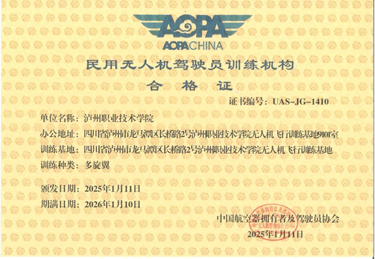 近日,泸州职业技术学院顺利通过中国航空器拥有者及驾驶员协会(AOPA- China)认证,成功获评民用无人机驾驶员训练机构。